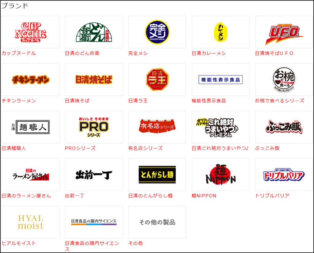 カップヌードル、どん兵衛、UFO、チキンラーメン、ラ王などのブランドが思い浮かびましたが、他にもこんなにたくさんのブランドを展開しています。