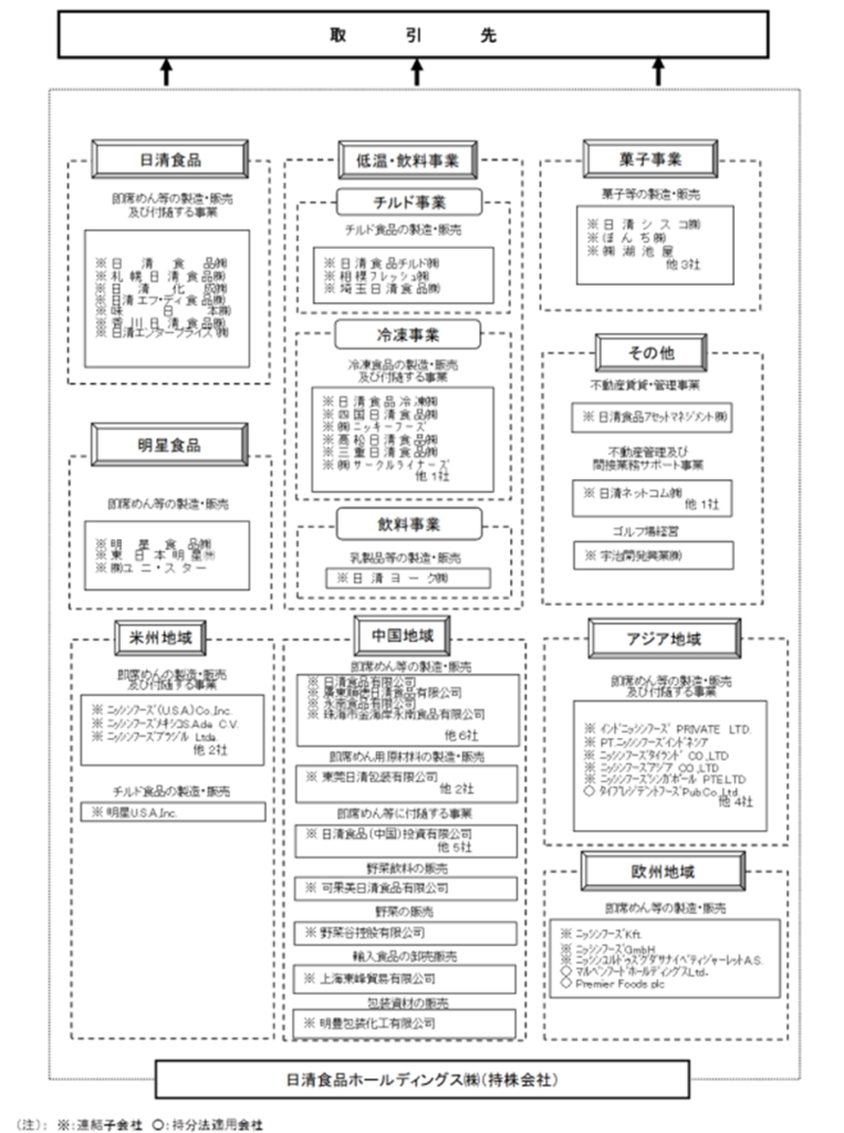 冒頭では中核企業の日清食品の商品について触れましたが、今回分析するのは日清食品ホールディングスで、実は日清食品以外にも傘下にたくさんの子会社・グループ会社を抱えているのがわかります。