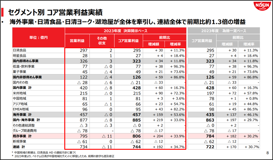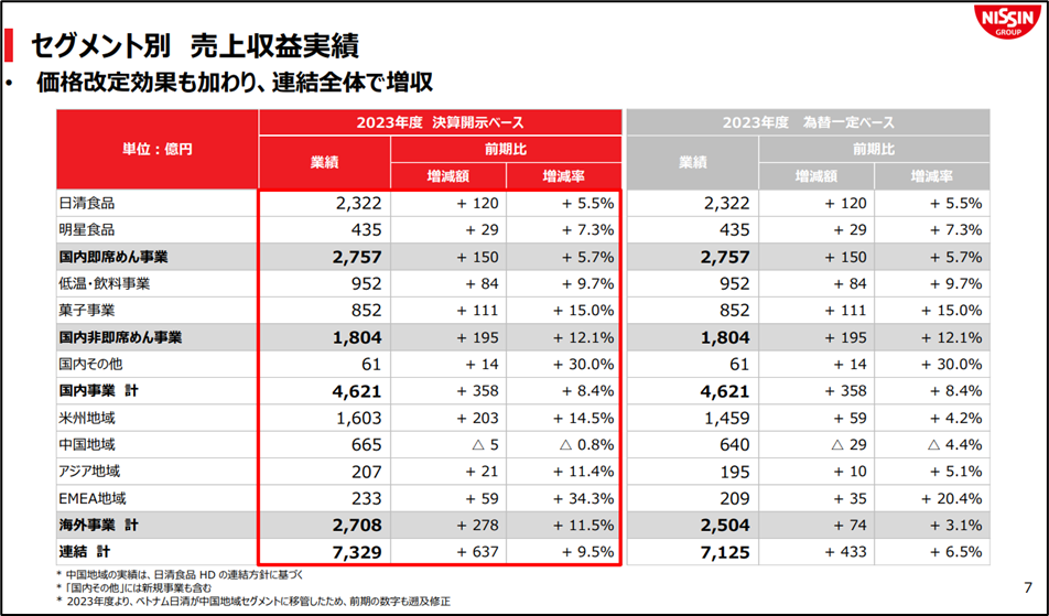 セグメントは、①日清食品、②明星食品、③低温・飲料事業、④菓子事業、⑤米州地域、⑥中国地域、⑦その他(国内その他事業、アジア地域、欧州地域など)に分かれています。