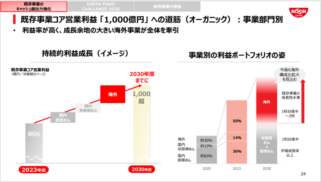 日清食品HDの成長イメージでは、やはり今後は海外構成比の更なる拡大を見込んでいるようです。