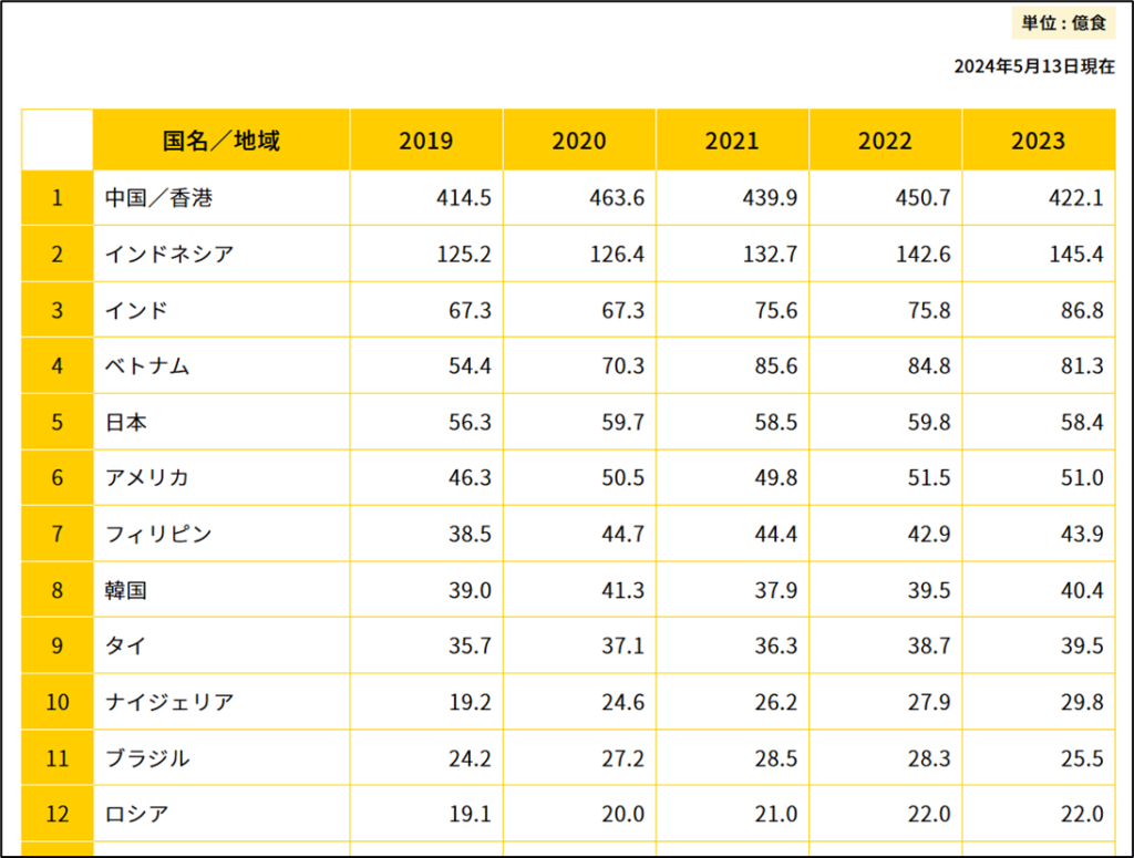 世界の即席めん市場を見ると、消費量が多いのは、中国やインド、東南アジアなどであることがわかります。