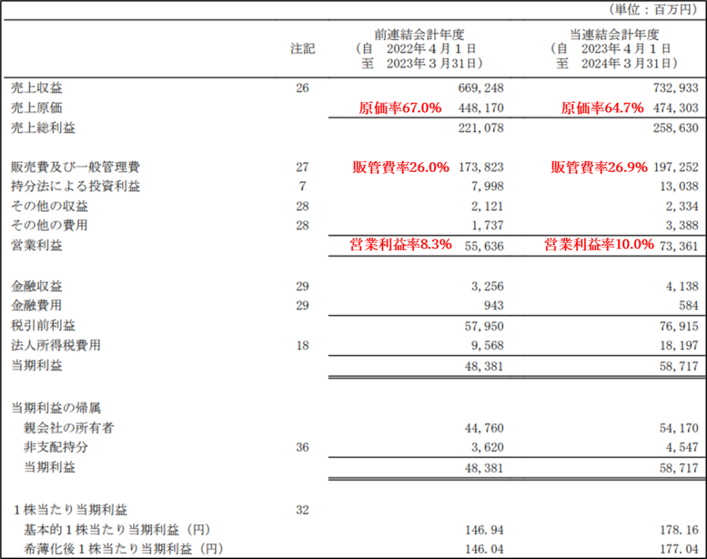 原価率が大きく下がっていますね。原価じたいは上昇していますが、国内・海外で価格改定を行っており、原価上昇分を上回る売上収益を上げることができたためと考えられます。