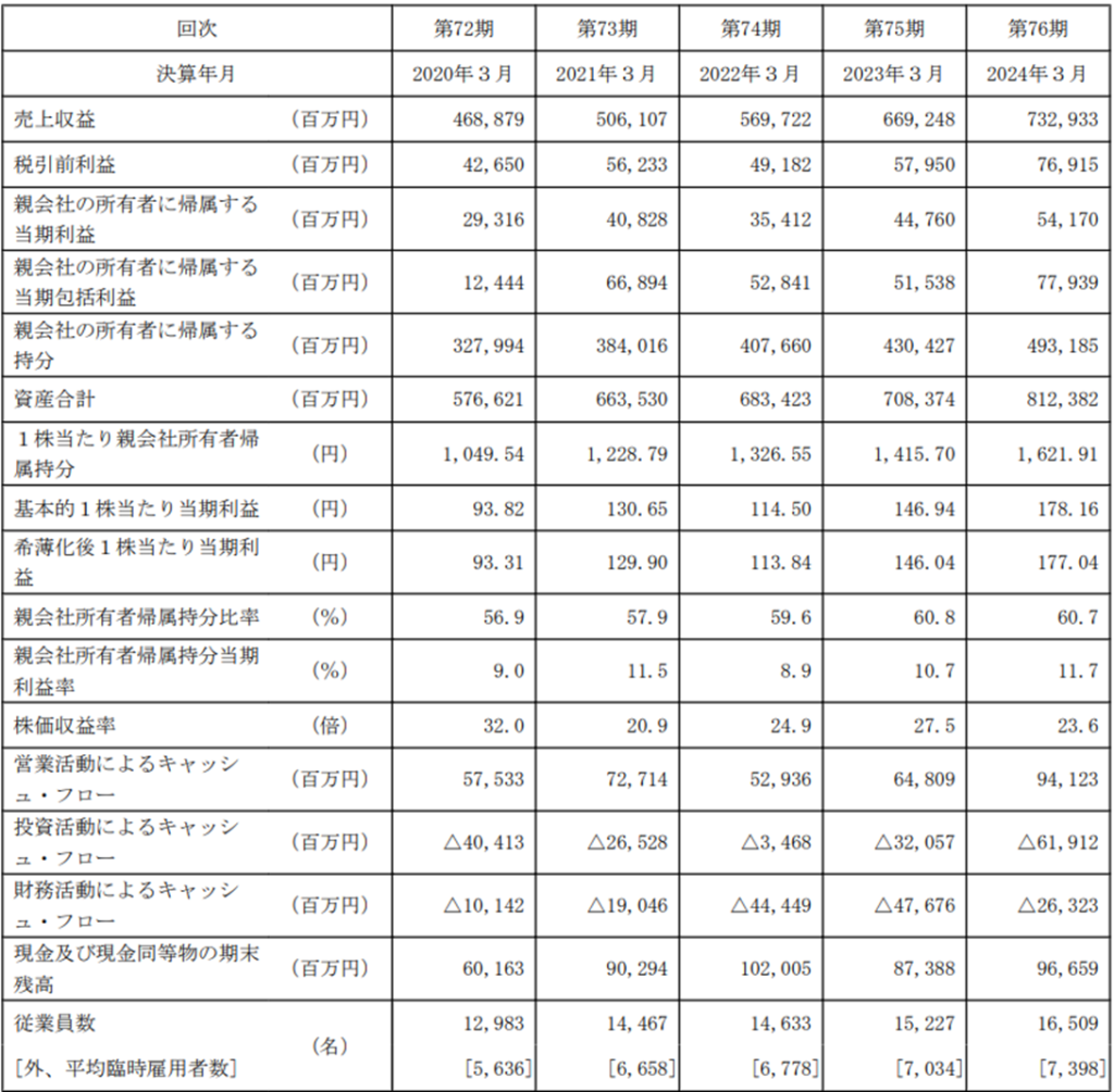 ROE(親会社所有者帰属持分当期利益率)も9.0→11.5→8.9→10.7→11.7と推移しており、5年平均は10.4%で、当ブログの投資基準の目安である10%をクリアしています。