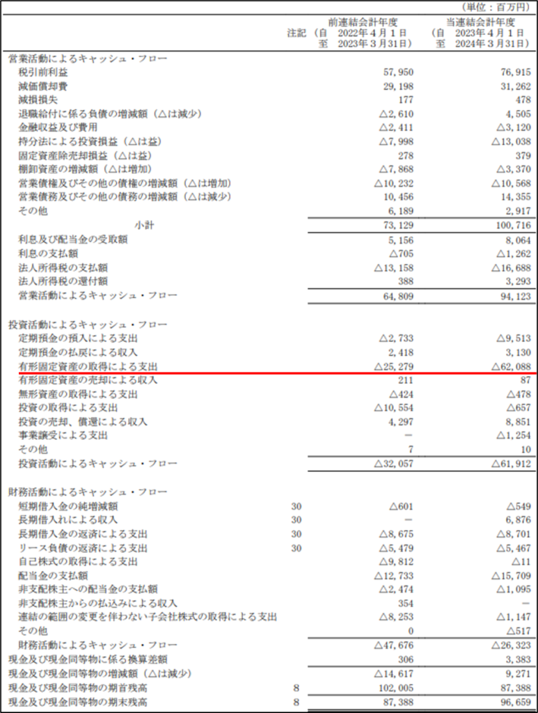 ただし、2023年度は、営業CFが大きく増加した一方で、投資CFのマイナスも拡大しています。 何が起きたのか、確認しておきましょう。