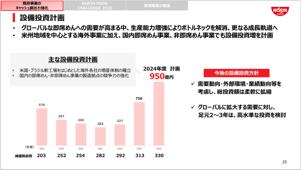 さらに、国内の即席めん・非即席めん事業でも設備投資増を計画しているとのことなので、今後数年間は投資CFの拡大によりキャッシュが溜まりにくい状況が続きそうです。