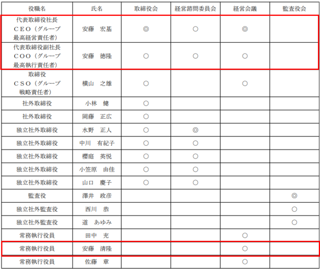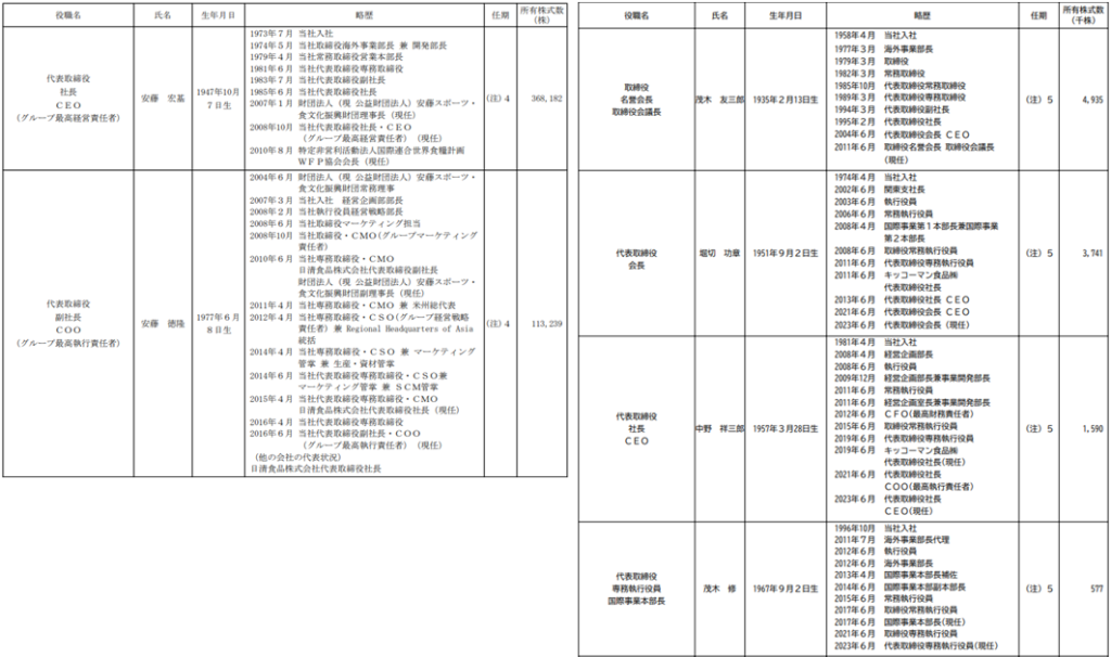 日清食品ホールディングスの経営陣として、代表取締役社長・CEOに安藤宏基氏、代表取締役副社長・COOに安藤徳隆氏、常務執行役員に安藤清隆氏の名前がありますね。