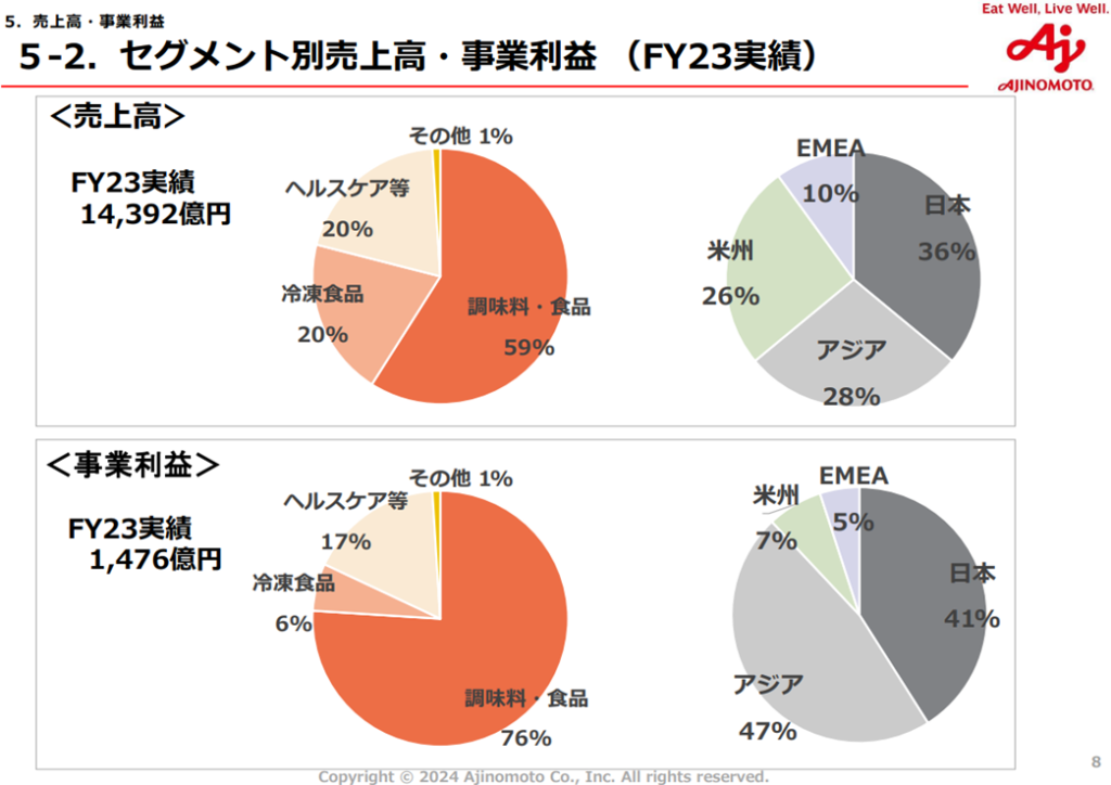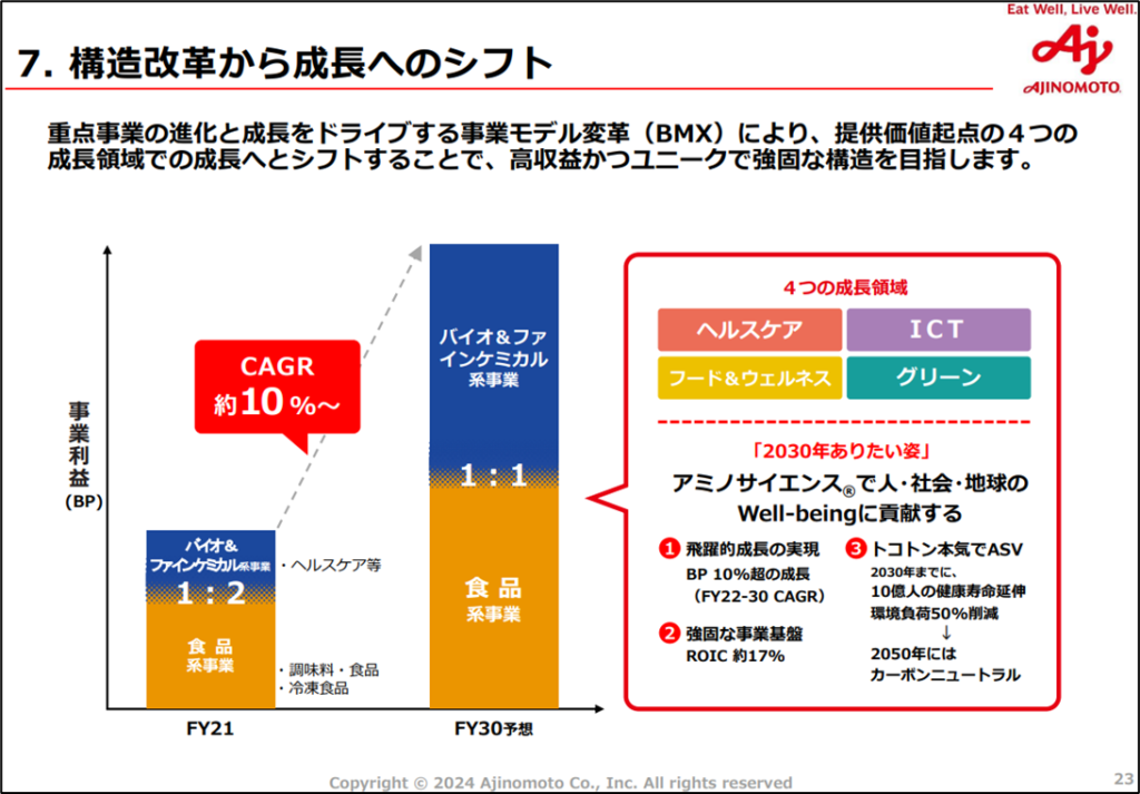 一方、冷凍食品事業は北米、欧州でM&Aを進めたものの利益率が下がっており、ヘルスケア等事業も動物栄養、国内製薬事業がコモディティ化したことにより苦戦していましたが、どちらも構造改革によって利益を出せる体質に変化しました。ただし、ヘルスケア等事業については、半導体やバイオ市場の不況によって2023年度は大幅減益に陥っており、右肩上がりに成長していく事業ではない点には注意が必要そうです。