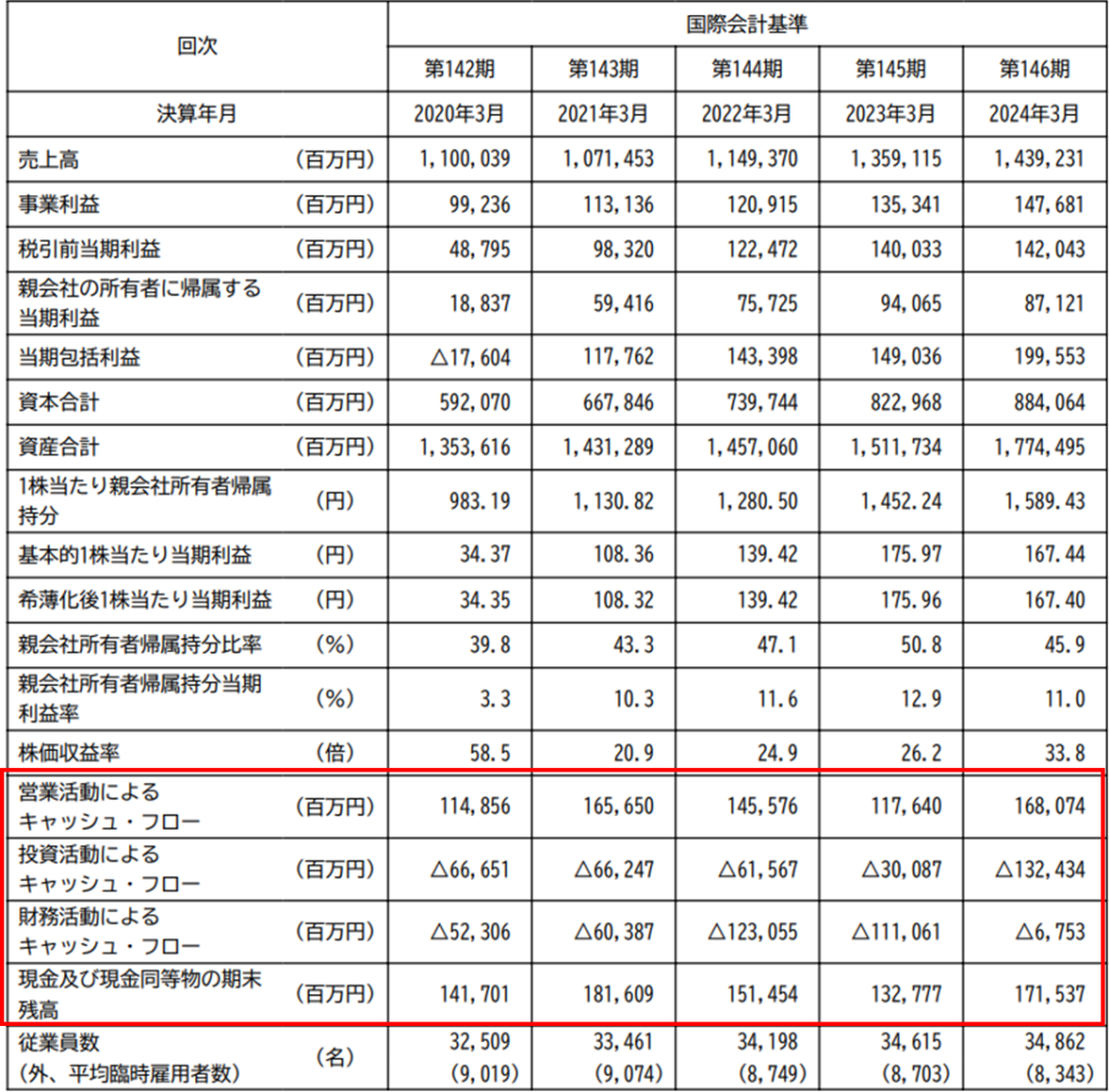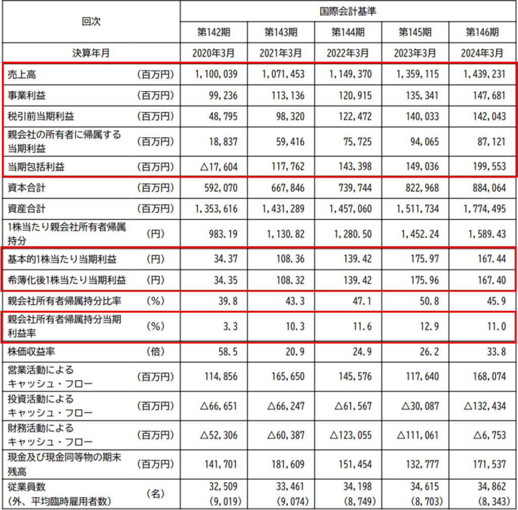 また、親会社所有者帰属持分当期利益率(ROE)は、3.3%→10.3%→11.6%→12.9%→11.0%と推移しており、5年平均は9.8%です。当ブログの投資基準では、ROEの理想は15%以上、目安は10%以上に設定していますが、直近4年間が10%を超えているので、許容範囲内だと思います。