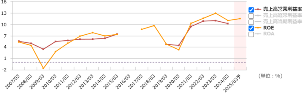 おや⁉利益率やROEが高水準なのは、ここ数年の間だけのようですね。