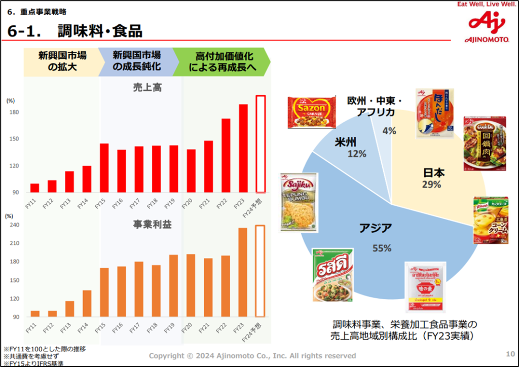 調味料・食品事業は、新興国市場の成長鈍化で停滞していましたが、減塩製品など高付加価値化にシフトしたことによって、大きく成長しています。