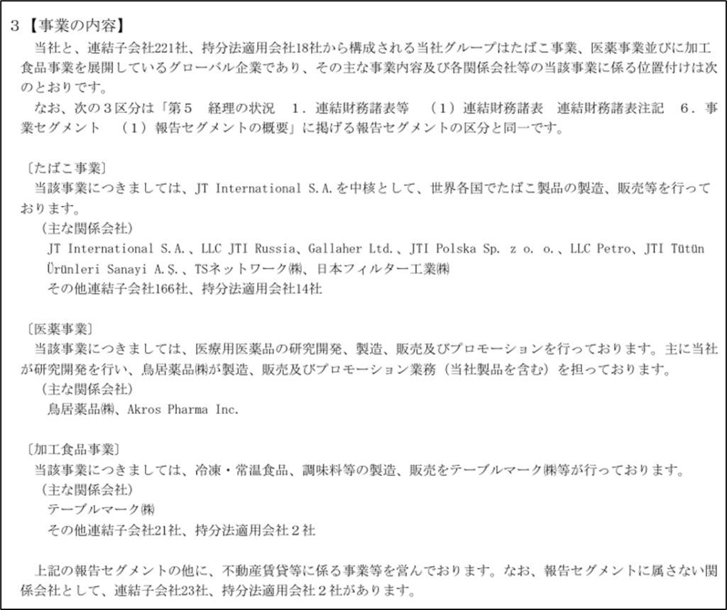 JTの事業セグメントは、①たばこ事業、②医薬事業、③加工食品事業の3つに分かれています。