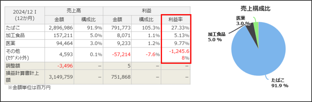 しかし、売上収益構成比の9割以上がたばこ事業なので、やはりたばこ事業への依存度が高いことがわかります。