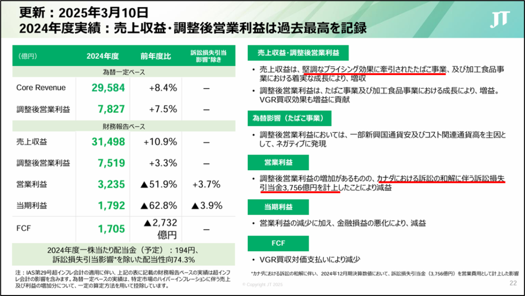 JTは、カナダのケベック州で、喫煙による健康リスクを十分に説明せずたばこを販売したとして、消費者団体らからフィリップ・モリス、ブリティッシュ・アメリカン・タバコとともに訴訟を起こされていました。2025年3月6日、3社が計325億カナダドル(約3兆5600億円)の和解金を支払うことで和解が成立したため、訴訟損失引当金を計上したものです。