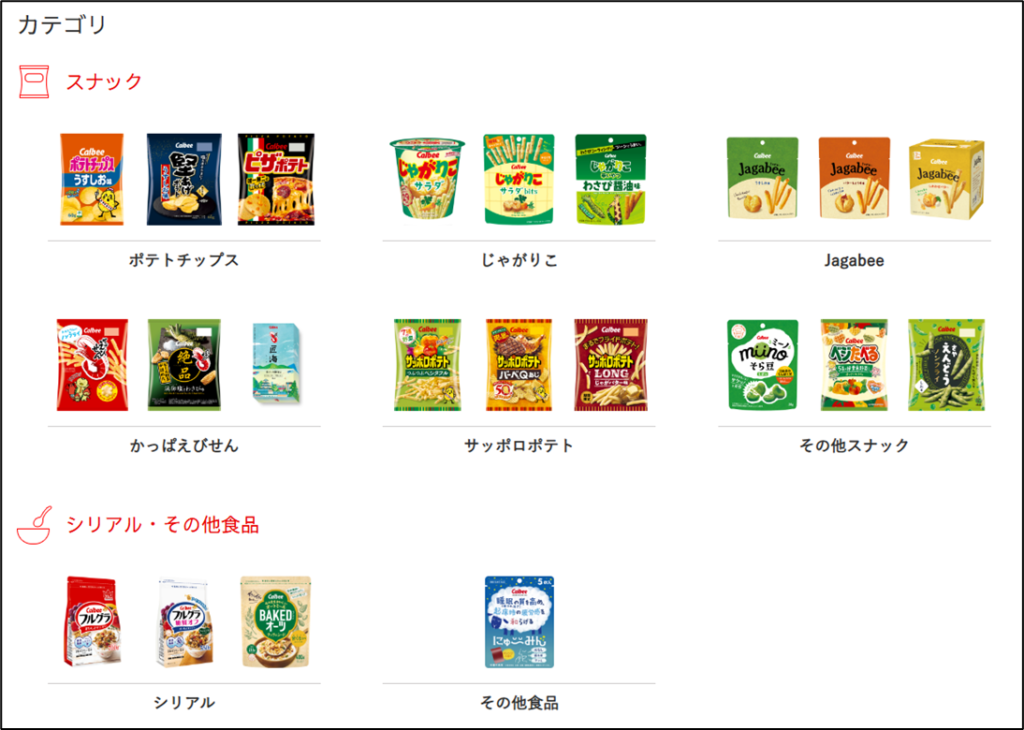 カルビーの商品だと、ポテトチップスやじゃがりこなど、スナック菓子が人気ですよね。他にも、フルグラなどもシリアルも扱っています。