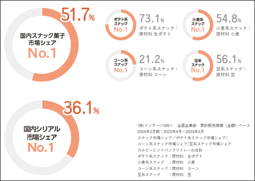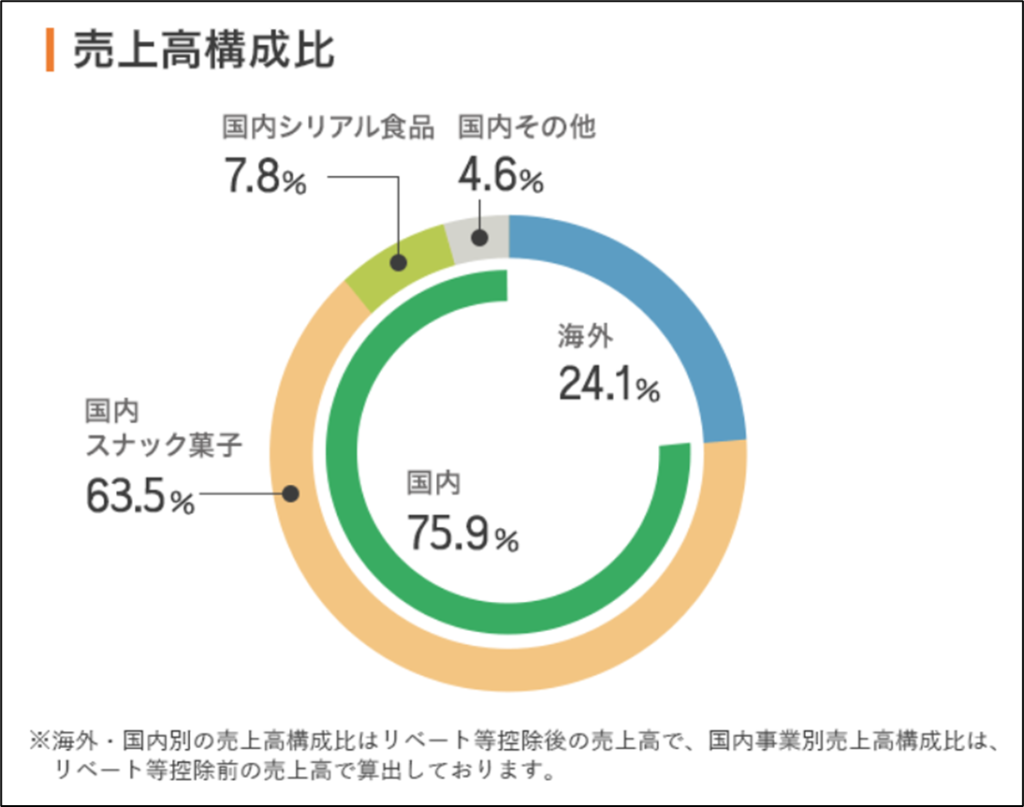 もう少し内訳を細かく見て見ると、国内スナック菓子が63.5%、国内シリアル食品7.8%、国内その他4.6%、海外24.1%となっており、国内スナック菓子のウェイトが高いことがわかります。