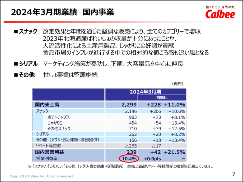 国内事業の営業利益率は10.4%で、当ブログの目標値である10%をクリアしています。