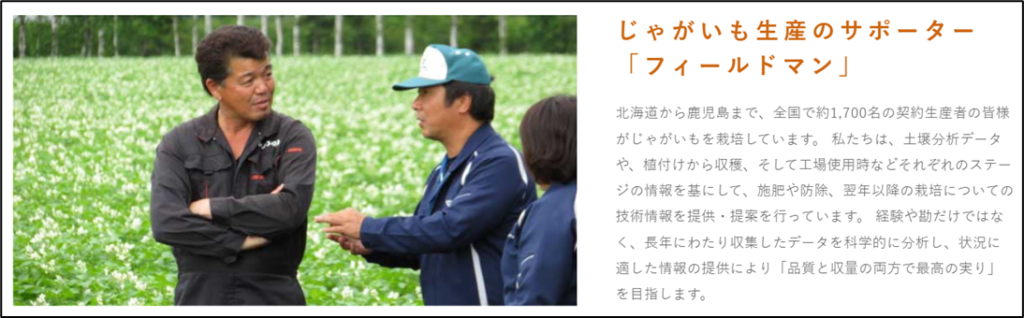 カルビーは、全国1700名のジャガイモ農家と生産者契約を結び、原料を安定調達しています。