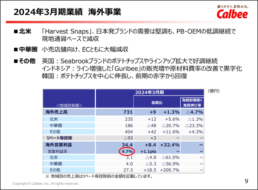 一方、海外事業の方は、営業利益率4.7%にとどまっています。国内事業に比べると、かなり苦戦していますね。