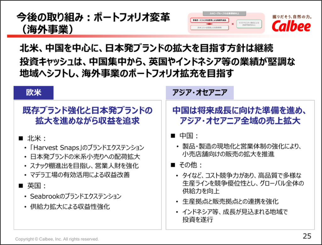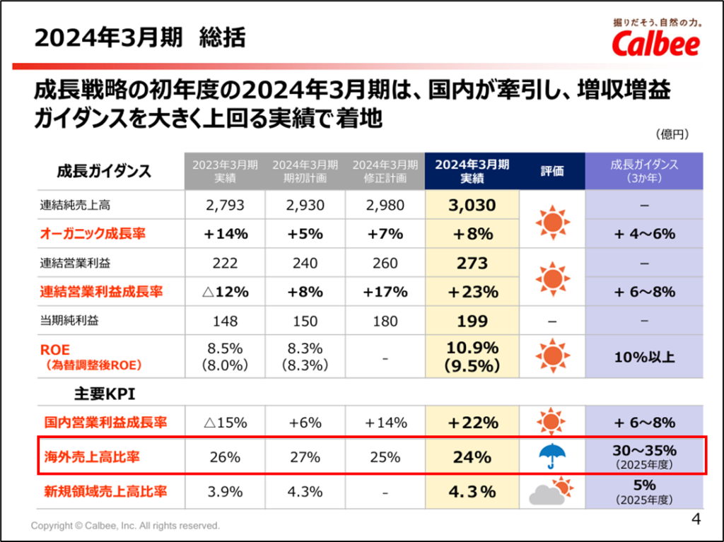 カルビーも例外ではなく、2025年度までに海外売上高比率30~35%を目標としていましたが、2024年度時点で24%しかなく、目標達成が困難であることを認めています。