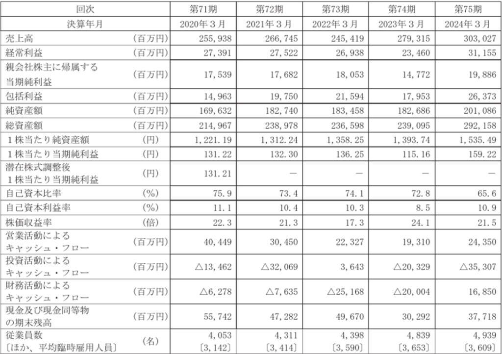 ROE(自己資本利益率)は、11.1→10.4→10.3→8.5→10.9と10%前後で推移しており、収益性に問題はありません。