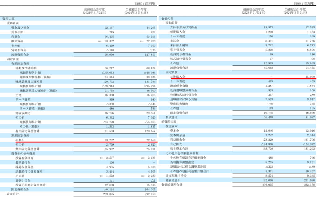 長期借入金が2022年度なし→2023年度250億円に増えていますね。調べたところ、同社上場以来初の長期有利子負債だそうです。借入金を活用して成長投資に充てるものと思われます。有利子負債は増加しましたが、自己資本比率は65.6%あり、財務は健全です。