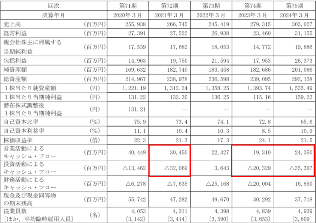 2020年度、2022年度、2023年度と、営業CFから投資CFを引いたフリーCFがマイナスになっています。