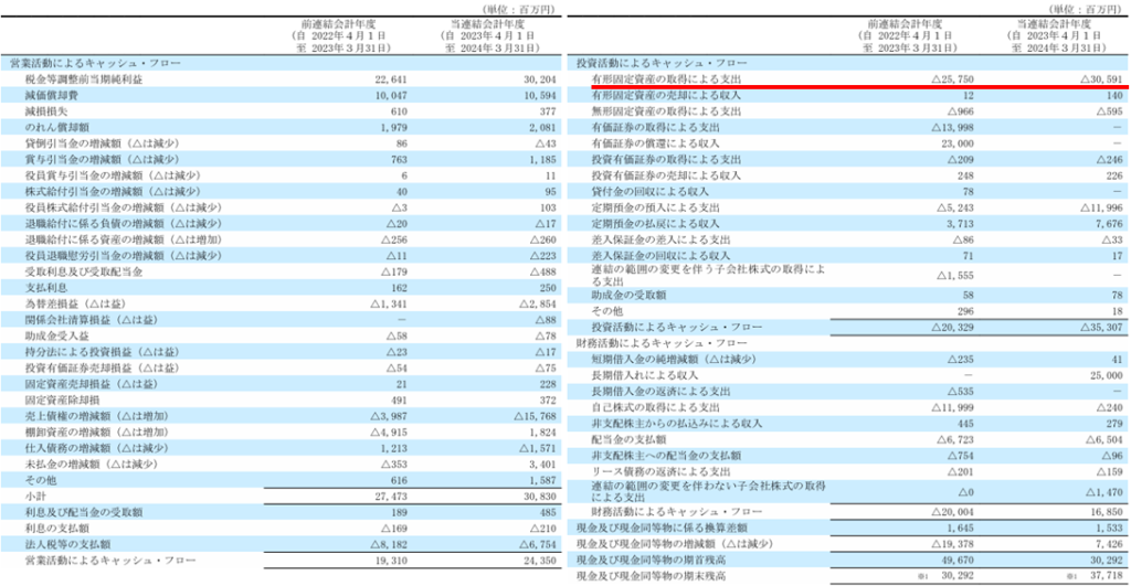 カルビーの直近のキャッシュフロー計算書を見ると、投資CFでは「有形固定資産の取得による支出」の金額が大きいことがわかります。
