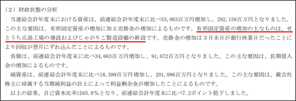 具体的に何を取得したかというと、経営者の分析に「せとうち広島工場の建設およびじゃがりこ製造設備の新設」とあります。せとうち広島工場は、最新鋭のマザー工場で、2025年3月期に操業を予定しているようです。