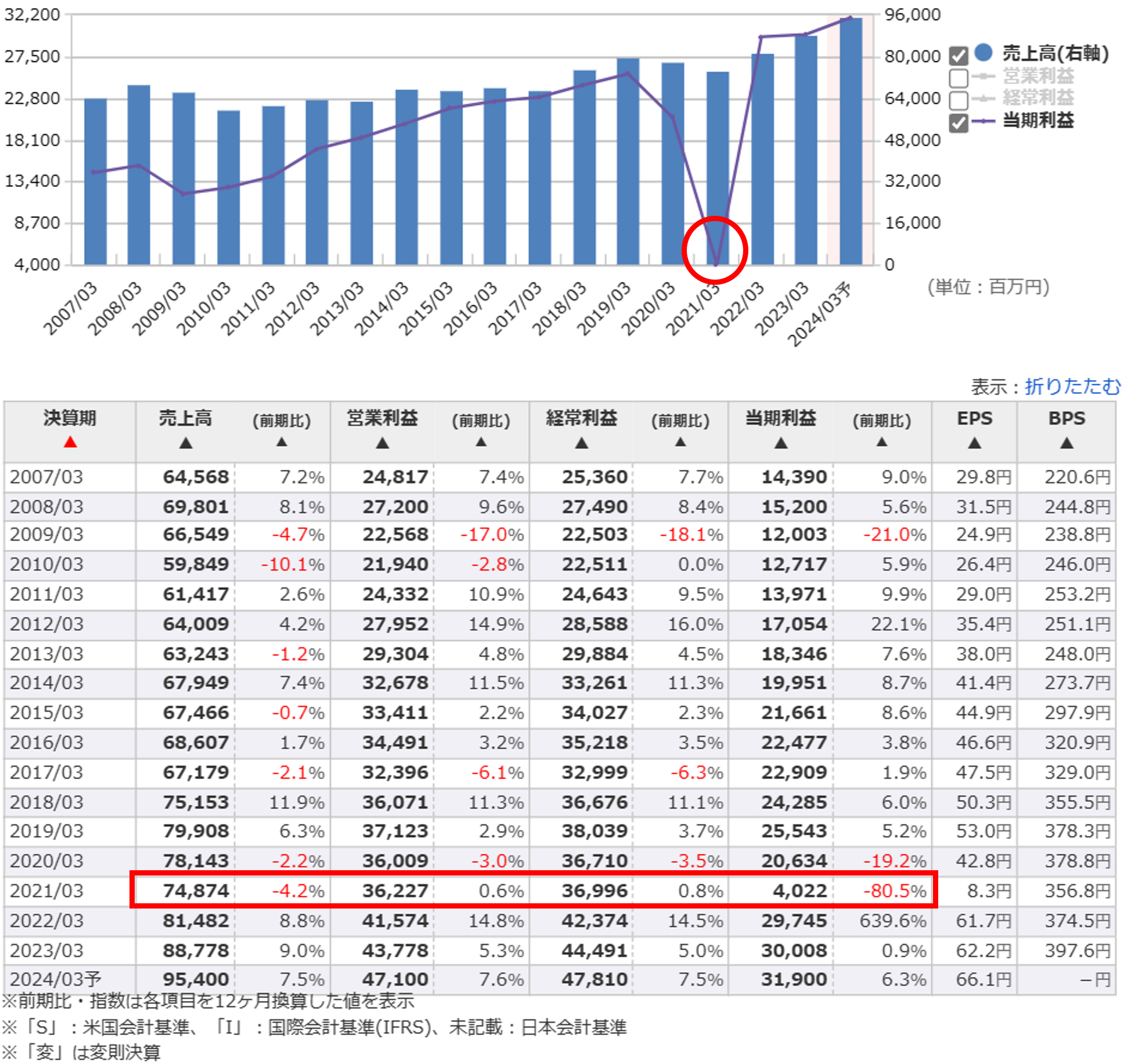 しかし、2021年3月期だけ、大きく凹んでいますね。売上高、営業利益、経常利益は例年と比べて大きな変化はないので、特別損失が発生した可能性があります。