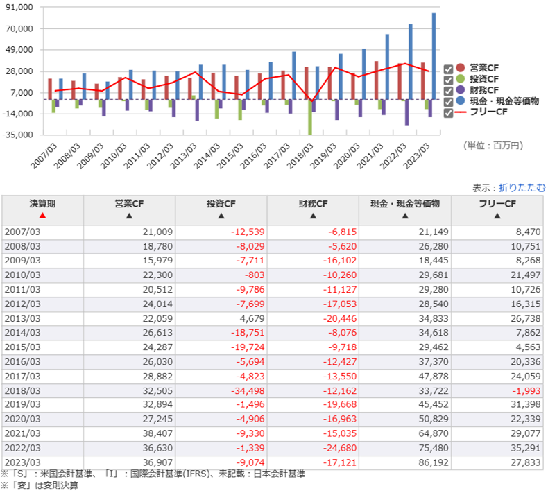 フリーCFは概ねプラスで推移しており、安定しています。2018年3月期にフリーCFがマイナスになってしまったのは、ジェイ・エー・エーの買収によって投資CFが増えた結果です。