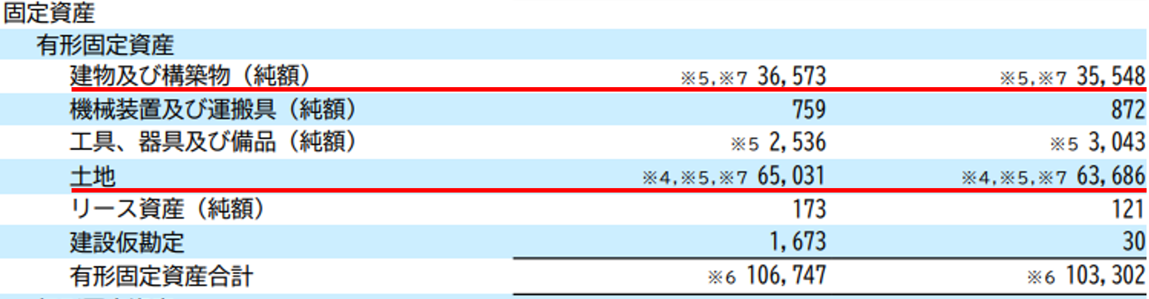 有形固定資産が多いですね。有価証券報告書を確認したところ、その大半が土地と建物でした。