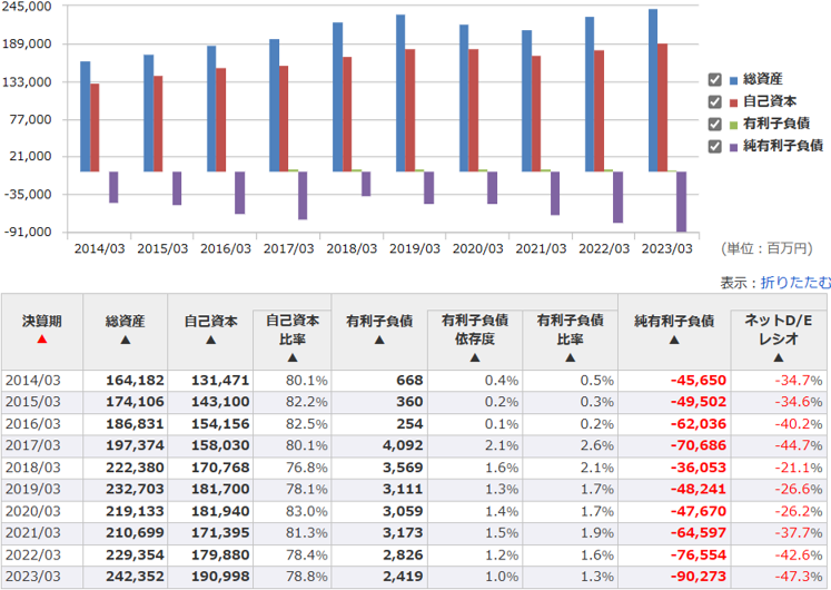 自己資本は分厚いですね。自己資本比率は80%近くを推移しています。有利子負債もほとんどありません。