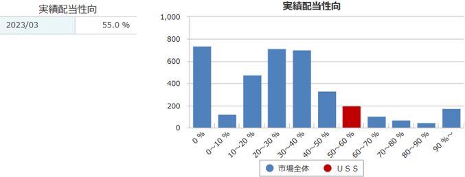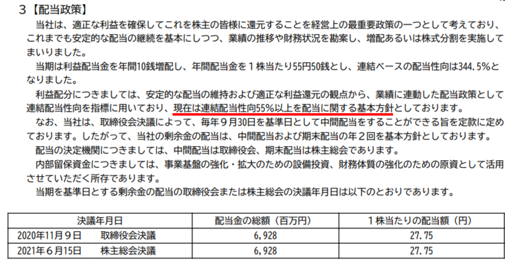 有価証券報告書によると、連結配当性向は55%以上とする方針のようです。「配当性向55%」という数字は、市場全体の中でもかなり良い部類です。
