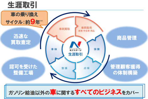 ネクステージの中期経営計画によると、お客さんに車を売ってから、保険、点検、整備、車検まで対応し、最終的にその車を買い取るまでの一連のサイクルを全てカバーすることを目指しているようです。これらのサービスをワンストップで提供することにより、1拠点当たりの収益性を高めることができます。