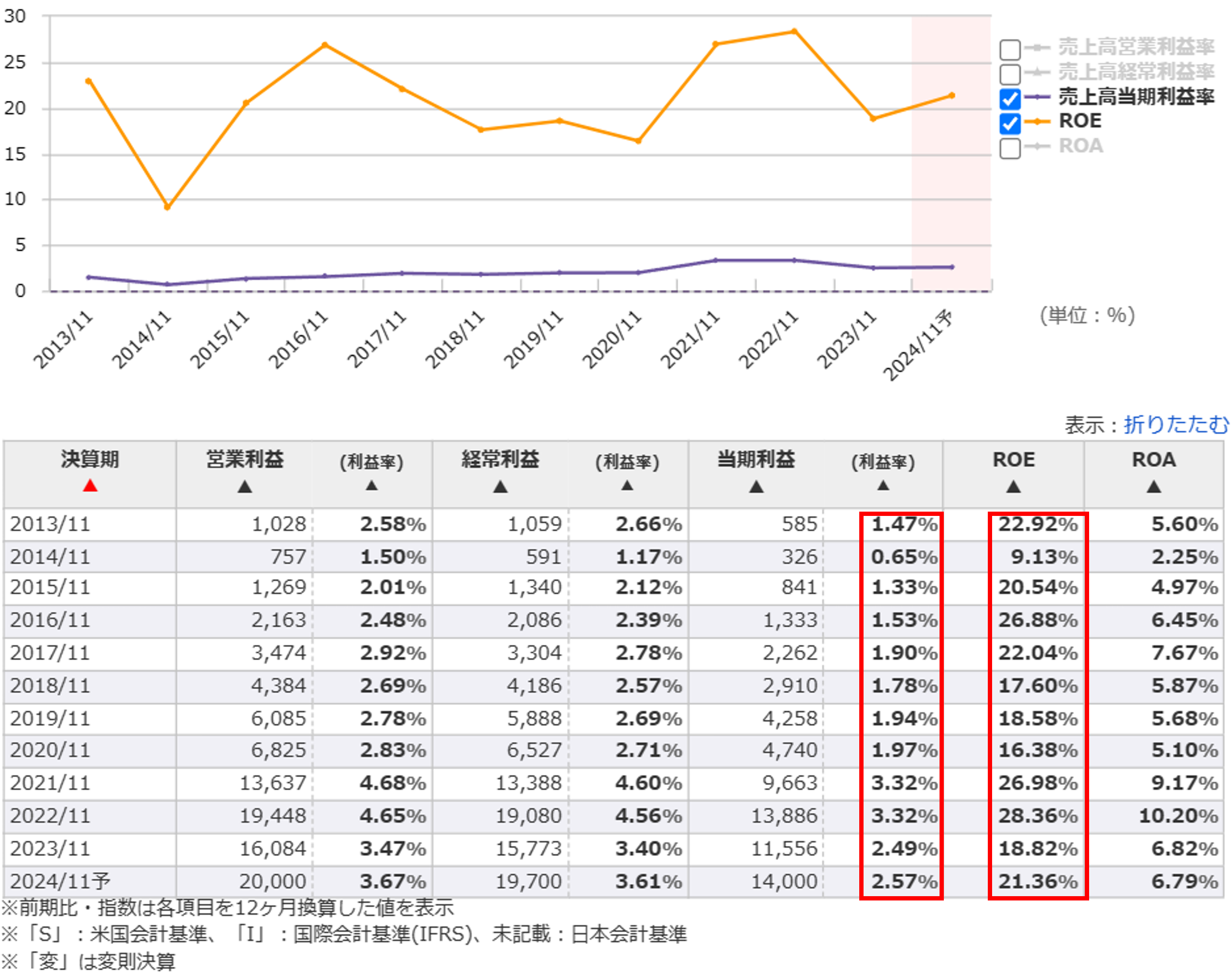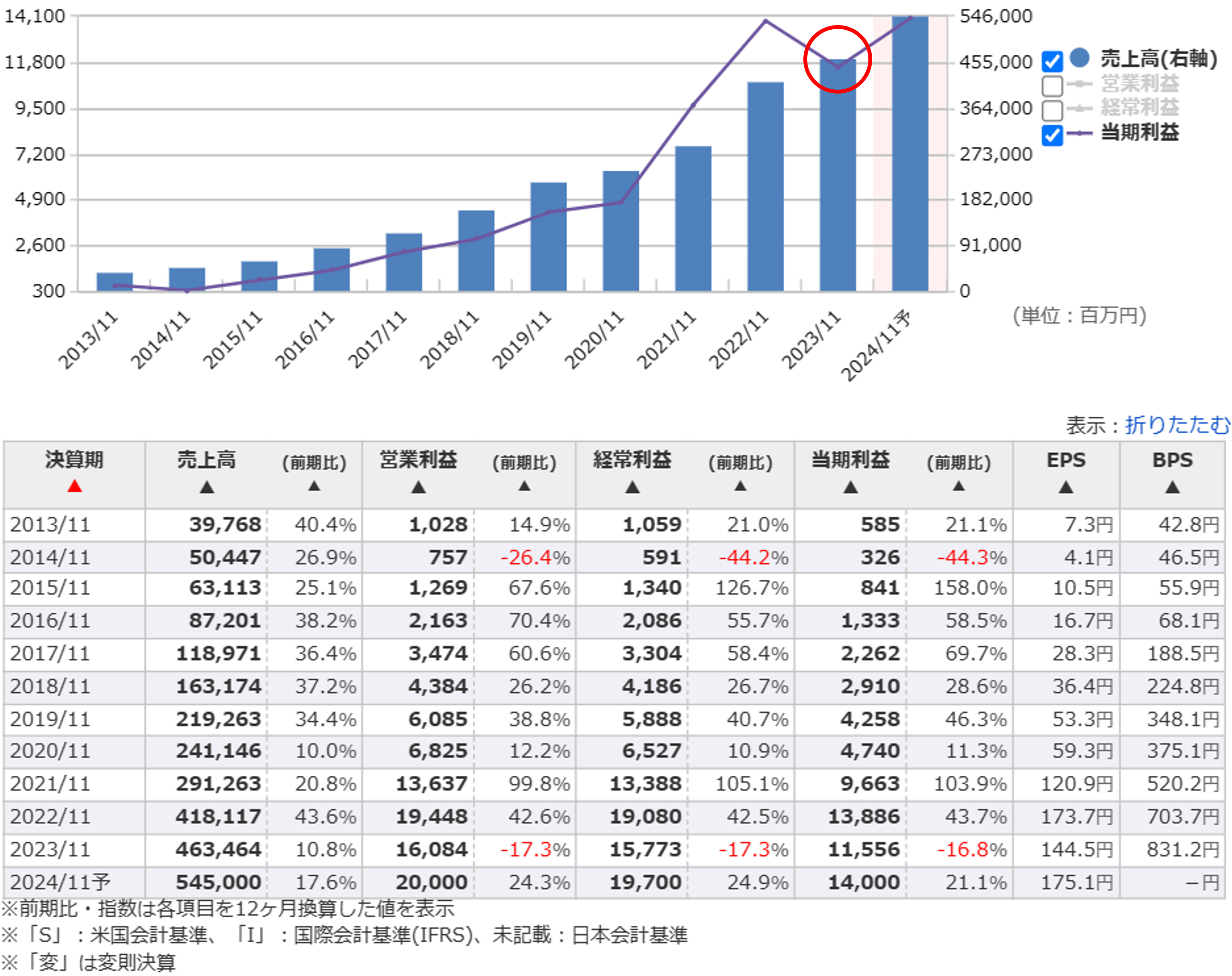 上場したばかりの2013年11月期は売上高約400億円、当期利益約6億円にすぎなかったのに、わずか10年で売上高は10倍以上、当期利益は20倍以上になっています。