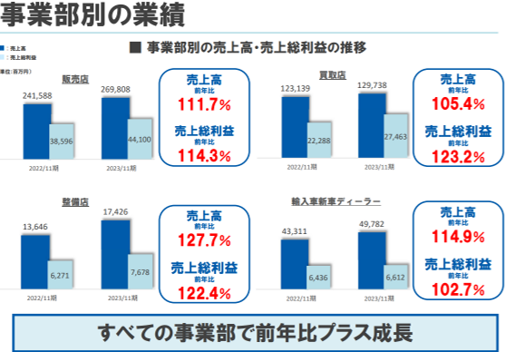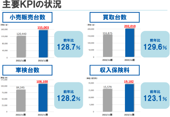 ネクステージの2023年11月期の決算説明会資料を確認したところ、同社が主要KPIとして重視している小売販売台数、買取台数、車検台数、収入保険料はいずれも前年比で大きく伸びています。