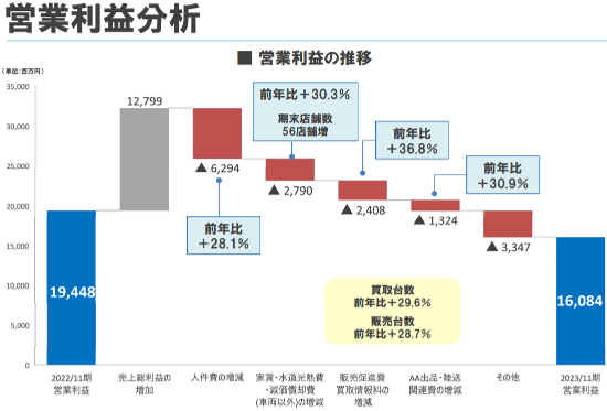 気になるのは、直近の2023年11月期は、売上高は伸びているのに対して、利益は減益となっています。原因は、やはりビッグモーター事件の影響でしょうか?詳しく分析してみましょう。