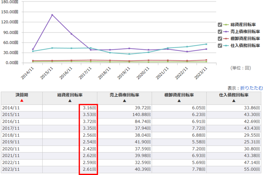 総資産回転率は良いですね。利益率が低い代わりに、在庫を早く掃いているようです。オペレーションがしっかり構築されていることがうかがえます。