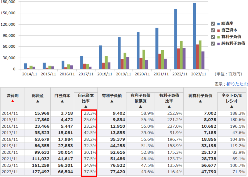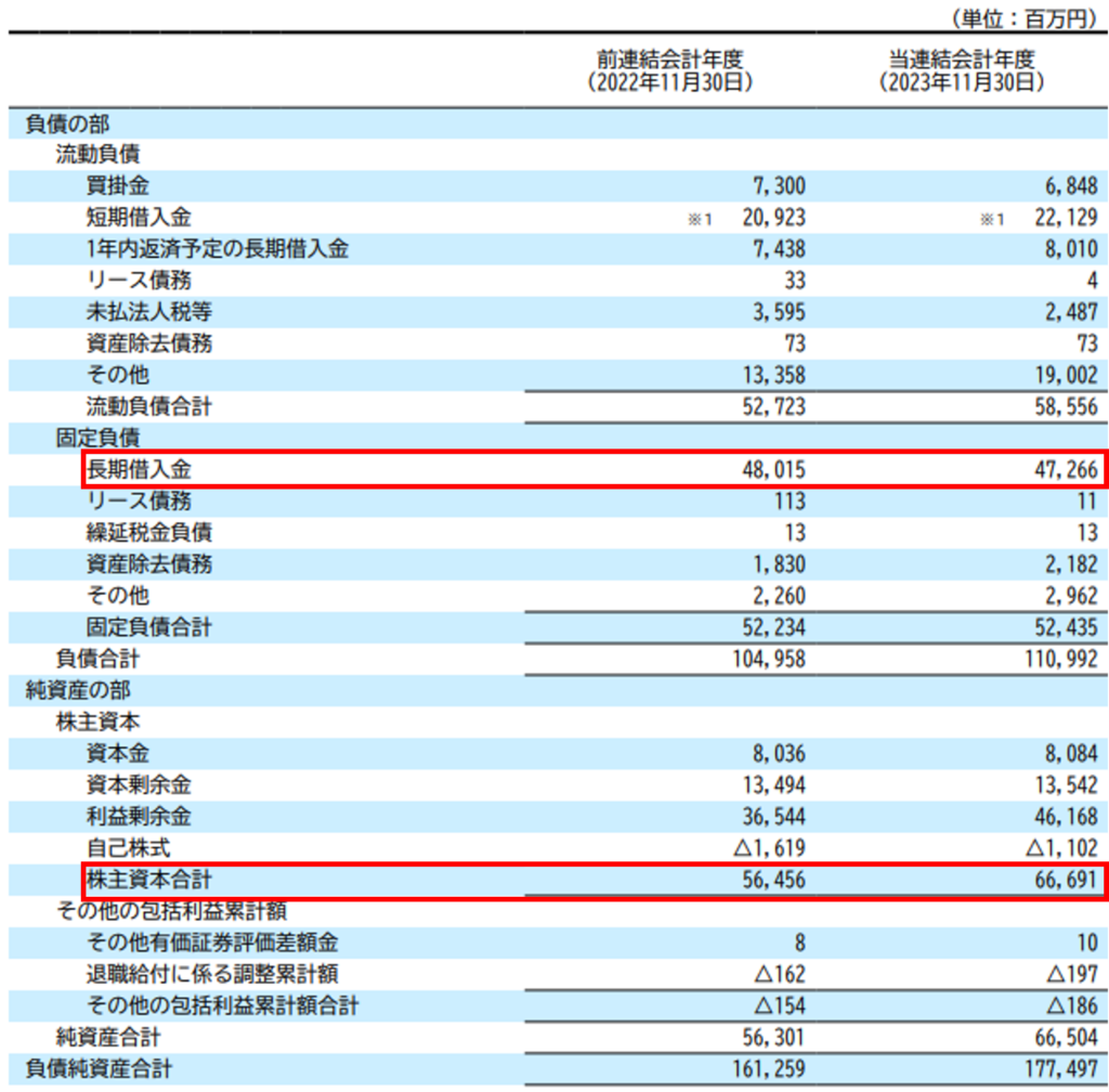 財務レバレッジも高いようです。財務レバレッジは自己資本比率の逆数で求められますから、2023年11月期の自己資本比率は37.5%なので、財務レバレッジは2.67です。財務レバレッジを利かせると、業績が良いときはROEを引き上げることができますが、業績が悪化すると借入金を返済できなくなるリスクもあります。