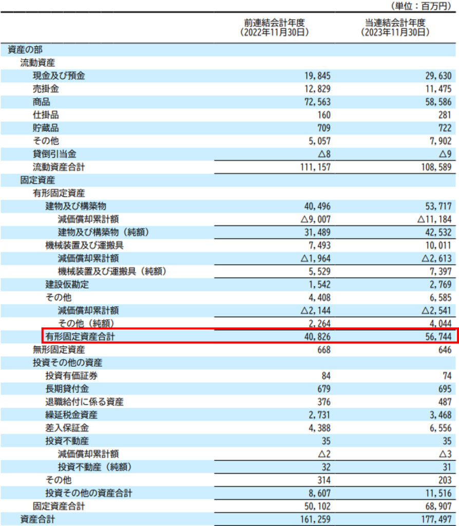 同社は2023年11月期に56店舗も新規出店しているので、有形固定資産が増加していることじたいには違和感はありません。