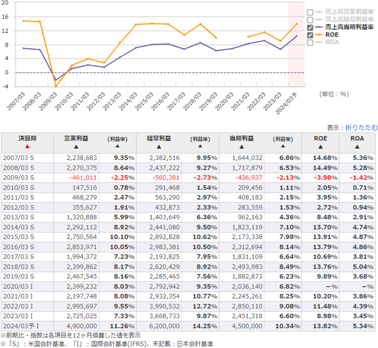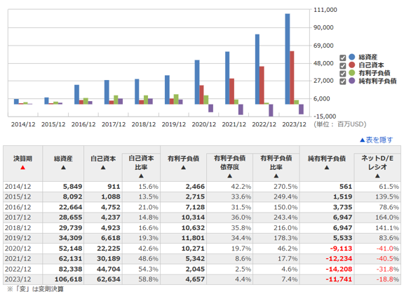 意外にも形の良いB/Sです。有利子負債はほとんどなく、ネットD/Eレシオはマイナスになっています。また、自己資本比率も年々上昇しており、2023年12月期は60%近くあります。