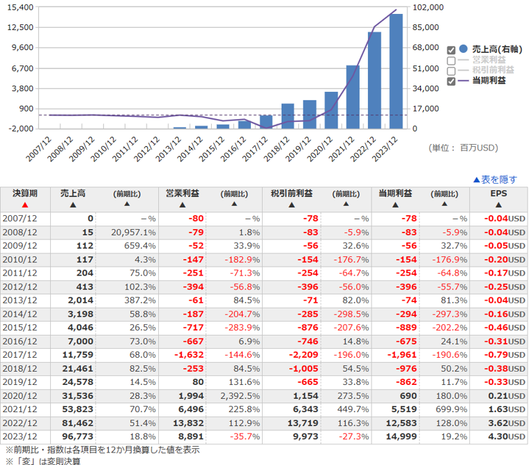 ここまでテスラの利益率が高い理由を確認してきましたが、成長率の方はどうでしょうか?