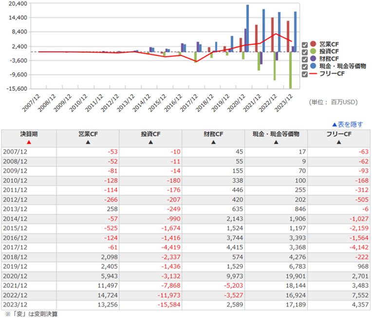 営業CFは2018年12月期にプラスになって以降、順調に伸びていましたが、2023年12月期は減益に伴って営業CFも前年より下回ってしまいました。