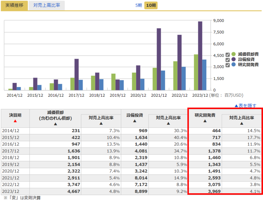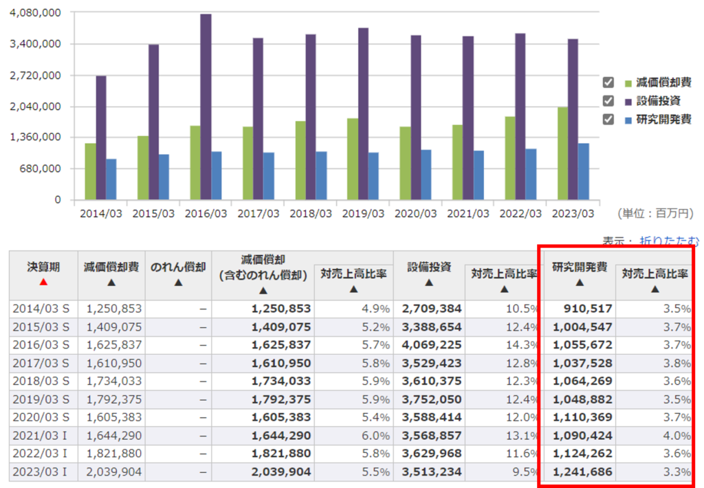 一方、トヨタの2023年3月期の研究開発費は約1兆2400億円ですから、テスラの研究開発費はトヨタの半分以下しかありません。