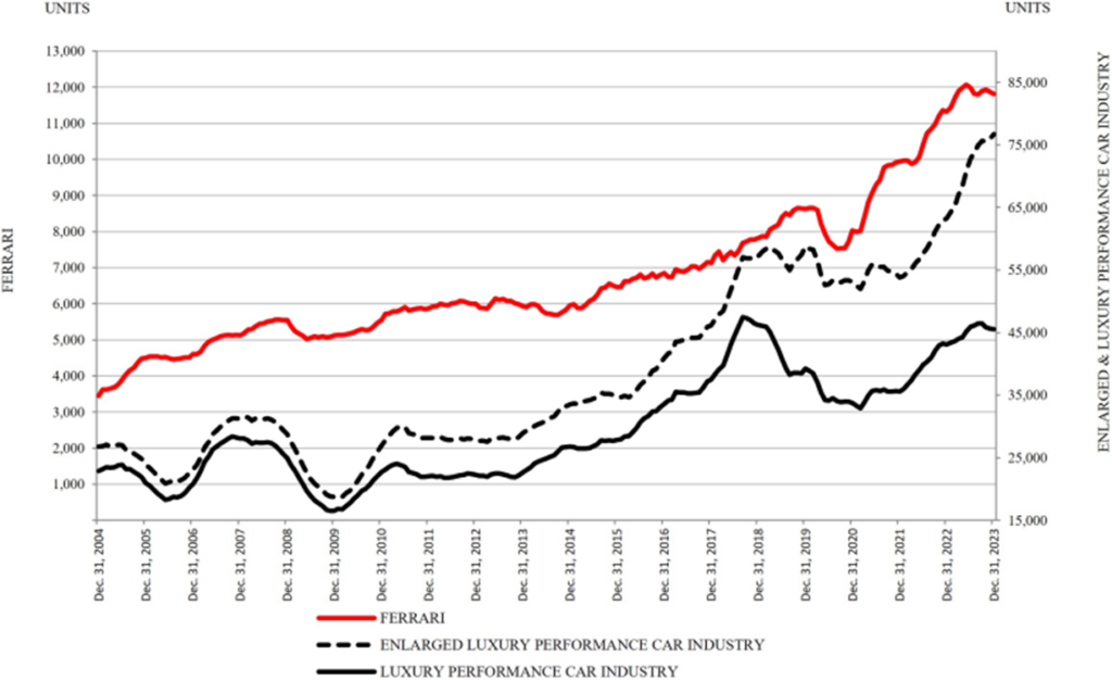 赤線はフェラーリの取引台数、黒の実線はラグジュアリーカー市場全体の取引台数、黒の点線は4ドアを含む広義のラグジュアリーカー市場全体の取引台数の推移を示しています(フェラーリにとっては、2ドアでなければ厳密には高級車とは認められないんですかね…)。