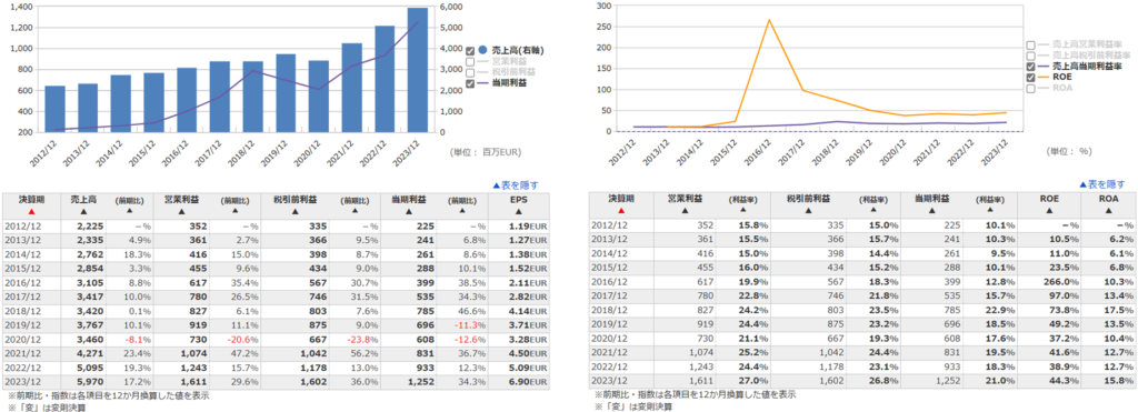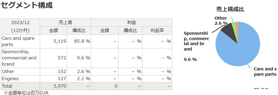 セグメント構成は、自動車及びスペアパーツ事業の売上高が5,119百万ユーロで、売上高全体の8割以上を占めています。同社の2023年の新車販売台数は1万3663台なので、単純計算で1台当たり売上高は約37万5千ユーロです。1ユーロ=170円として計算すると、1台当たり6400万円で売れていることになりますね⁉
