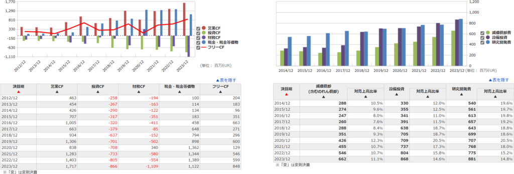キャッシュ・フローも安定していますね。フリーCFは一貫してプラスを保っており、現金・現金等価物も順調に積み上がっています。